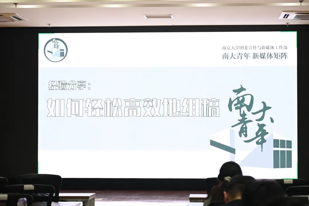 主讲人高豫来同学结合实际工作经验,以“五个平台、两个中心、一套流程、一组数据”为线索,介绍了“南大青年”微信公众号的运转模式;进而围绕“宣传材料如何写好”这一主题,将宣传材料的撰写分为开动之前和开动之后两个阶段,区分了宣传材料的五种类型,并通过举例分析、互动讨论等方式,为同学们带来了一堂精彩的新闻类稿件写作课程。