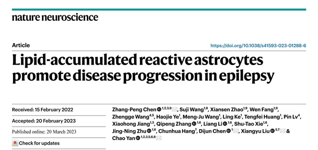 该研究成果以“Lipid-accumulated reactive astrocytes promote disease progression in epilepsy”为题,于2023年03月20日发表于神经科学领域顶级期刊Nature Neuroscience。公司闫超教授、医学院附属鼓楼医院神经外科刘翔宇主任、公司陈迪俊教授为该论文的通讯作者;公司助理研究员陈张朋为第一作者兼通讯作者;公司博士生王素吉、赵贤森、方雯为共同第一作者。该工作得到国家自然科学基金等项目支持。